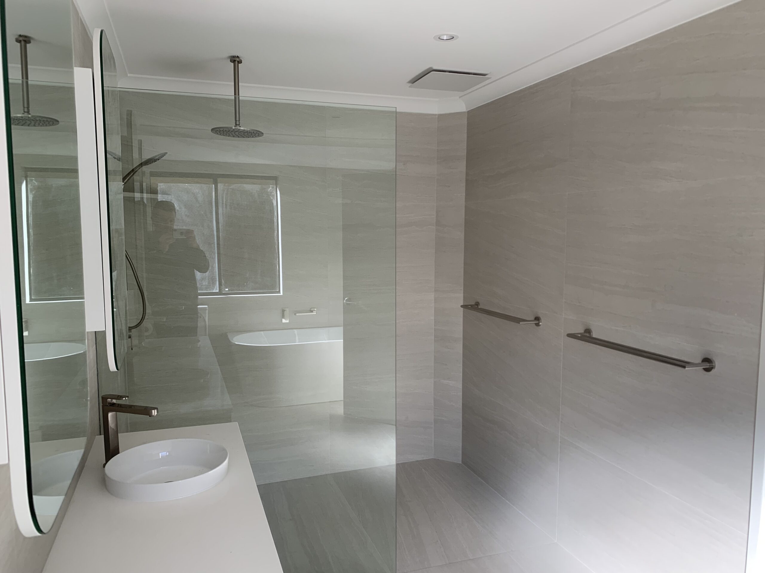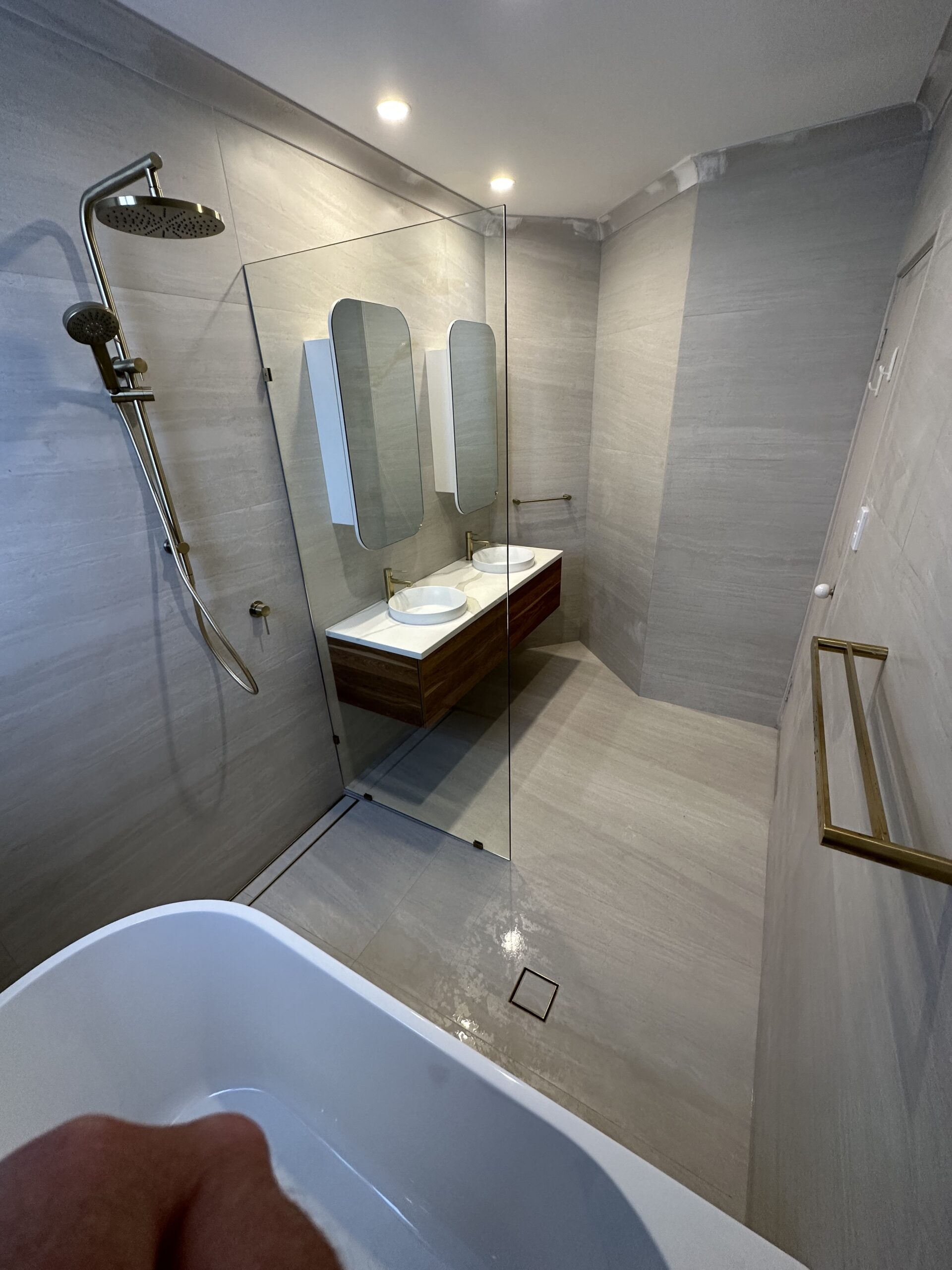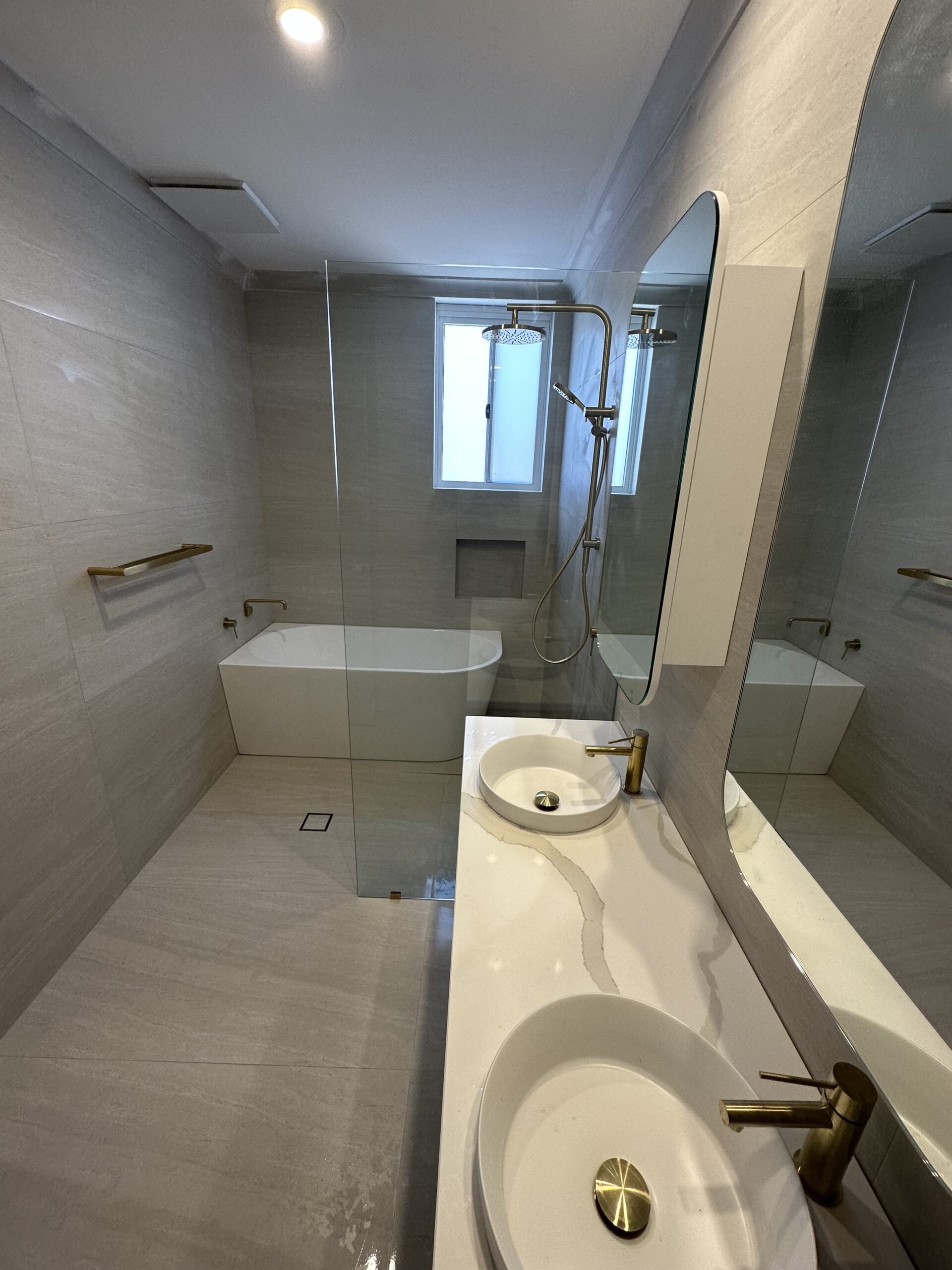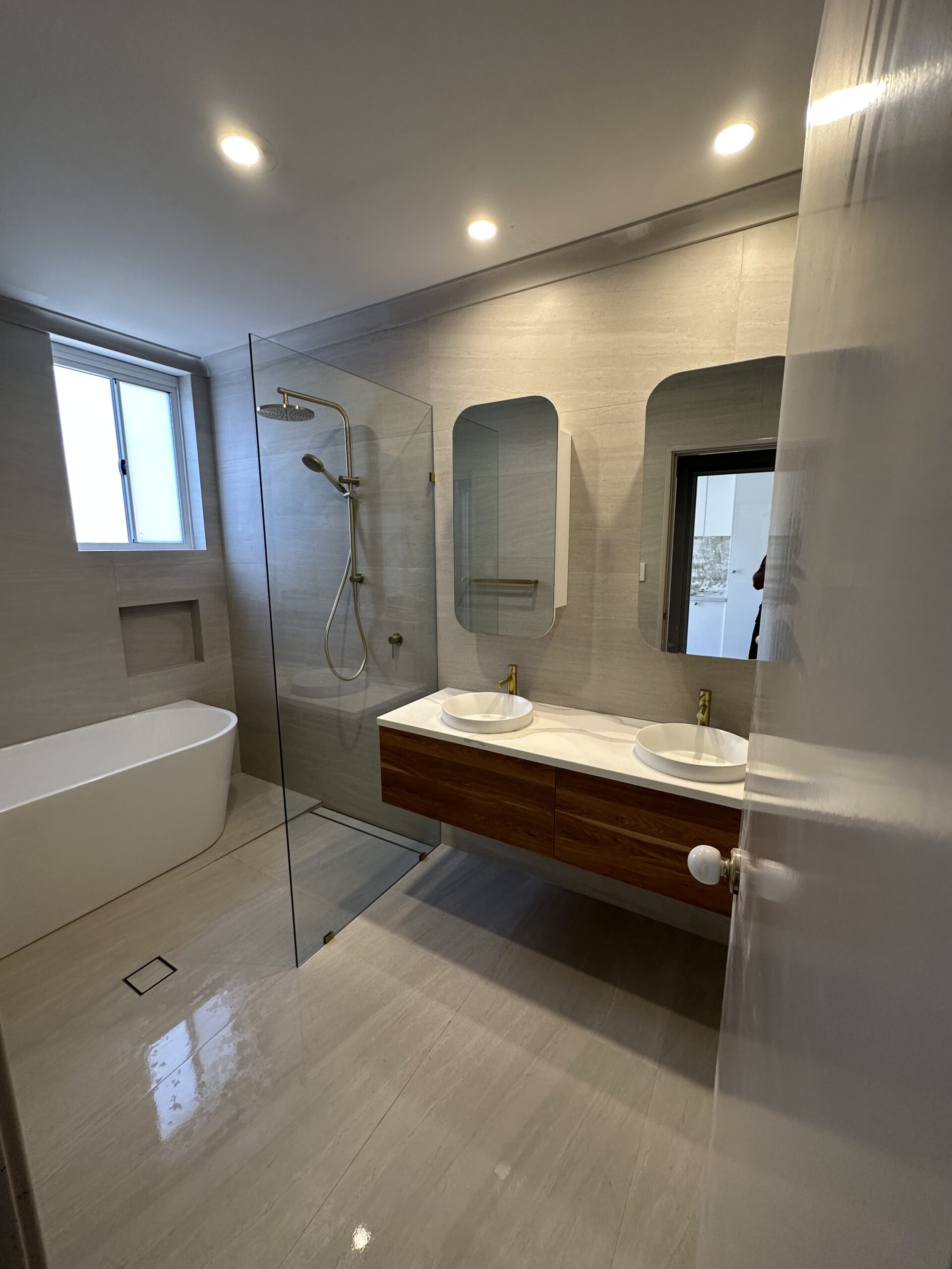 We also included hidden storage mirror cabinets, which feature double power points, making it easier for the family to store and access bathroom essentials. The linear draining in the shower ensures a clean, minimalist look, while being highly efficient. For added convenience, we installed a back-to-wall bathtub with a built-in niche for storage, making bath time easier while maintaining a sleek design.