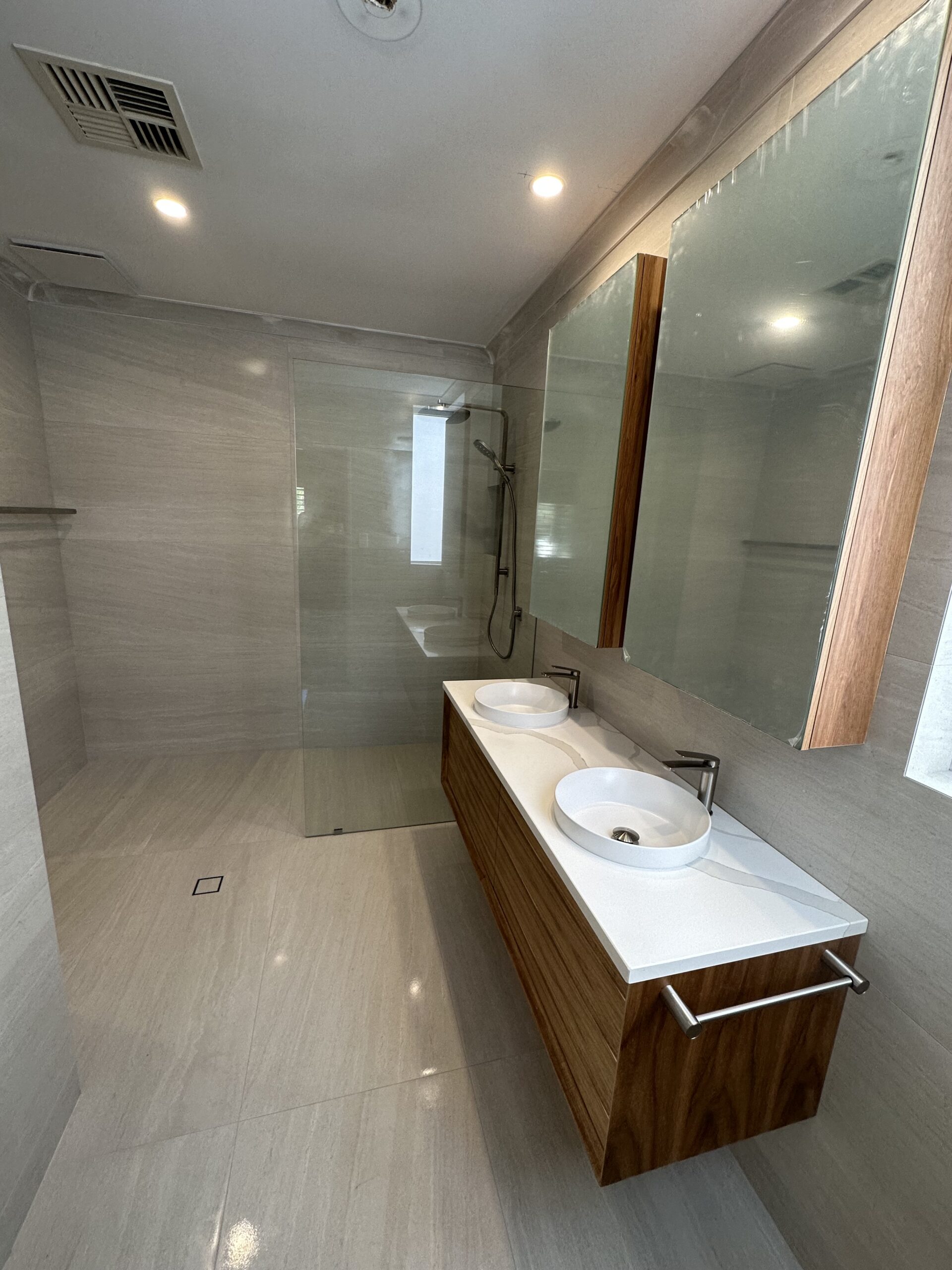 For the master ensuite, we chose 1200 x 600 porcelain tiles, providing a luxurious feel with their large format and minimal grout lines, making cleaning a breeze. The design features twin sinks, perfect for shared use, while maintaining ample space for personal items.