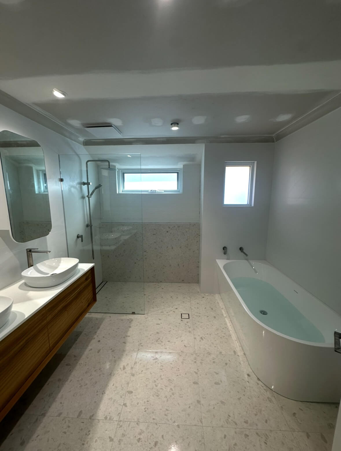 Other key features include a wall-hung timber vanity with twin vessel basins, mirrored cabinets with integrated storage, and a frameless glass shower panel that keeps the sightlines open and the room feeling spacious. The updated lighting and extraction system ensure the space is as practical as it is good-looking.