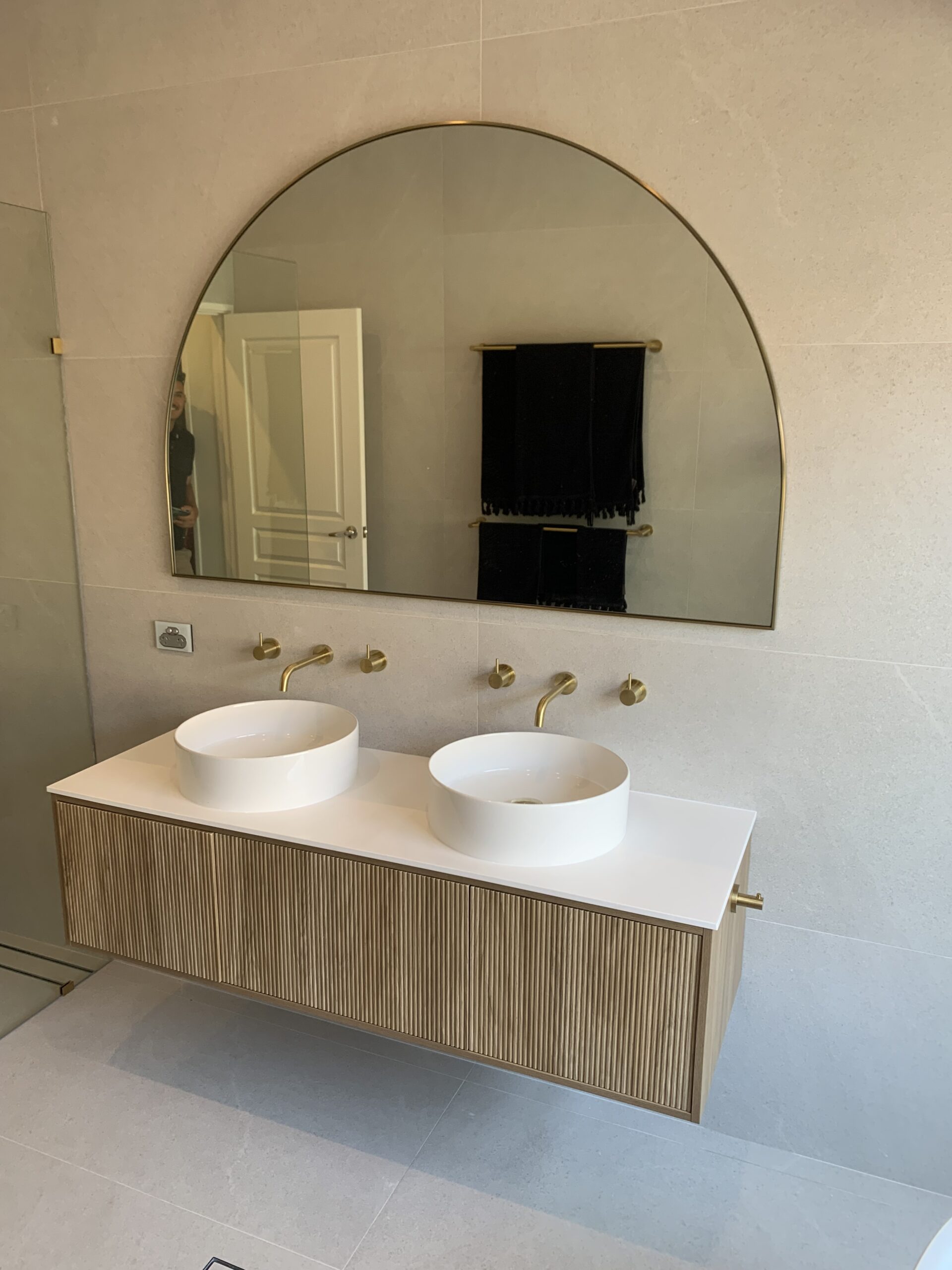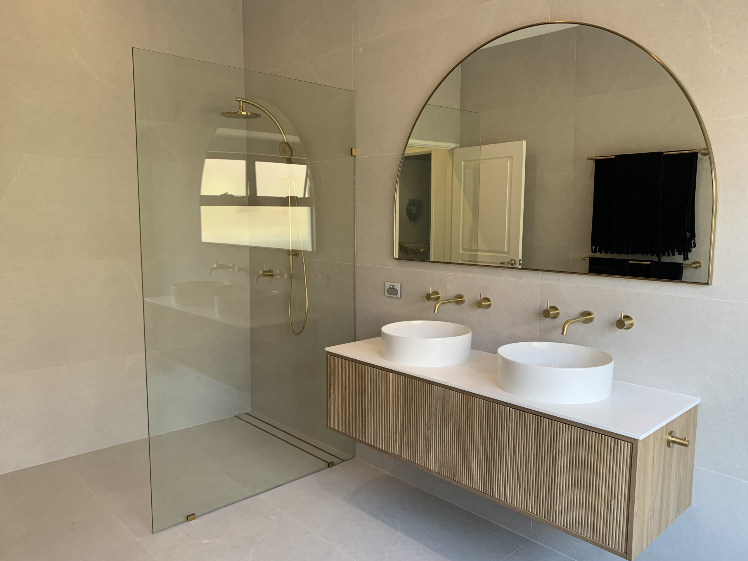 The standout feature in this bathroom is the gold Phoenix wall-mounted tapware, which adds a touch of opulence to the space. These elegant fixtures complement the twin sinks, which sit below a wall-mounted cupboard offering ample storage while maintaining a clean, minimalist look.