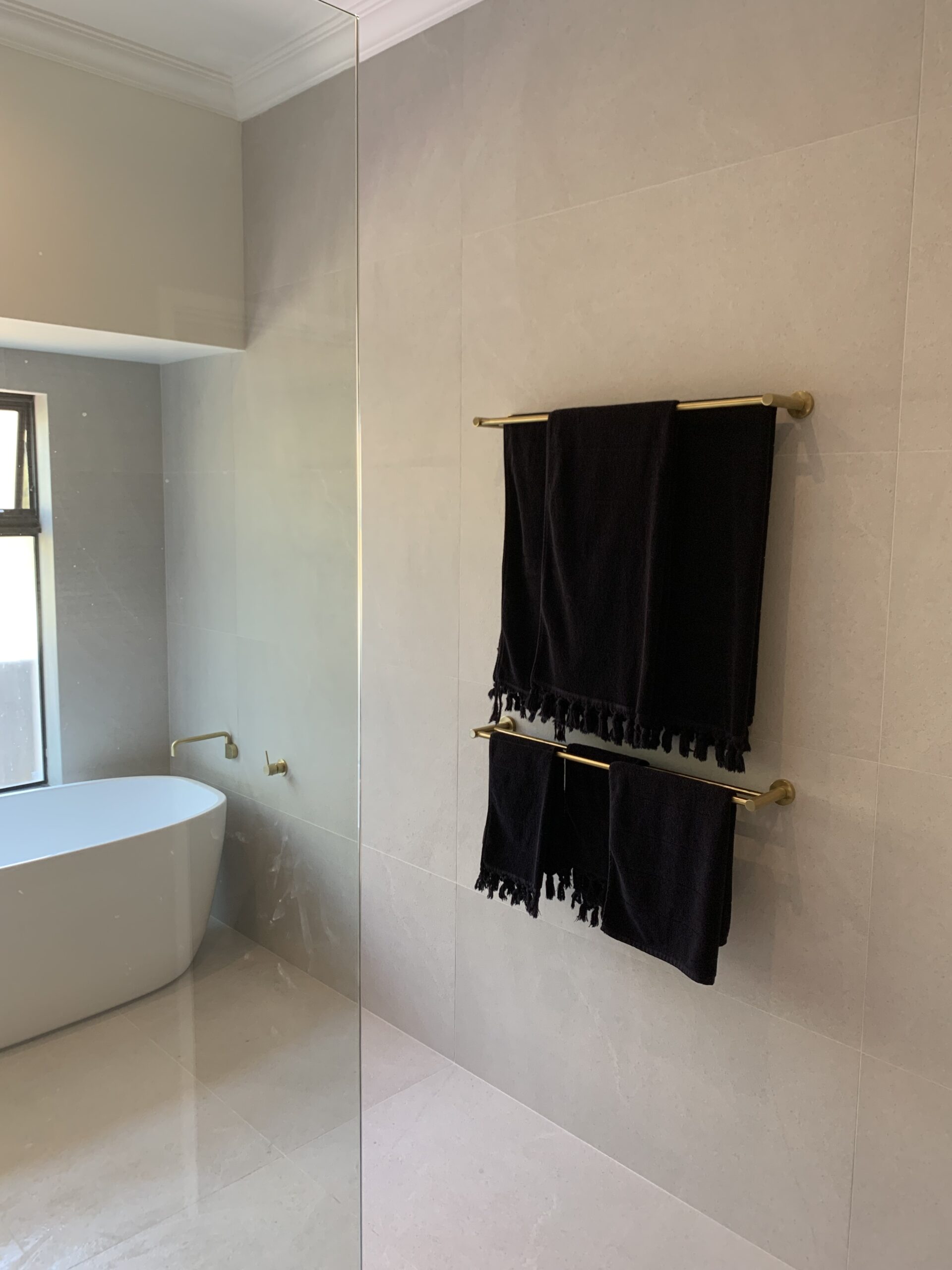 Opposite the shower, a freestanding bath is set beneath a large window, allowing natural light to flood the room while providing a serene space for relaxation. Multiple wall-mounted towel rails were installed to ensure functionality without compromising on style.
